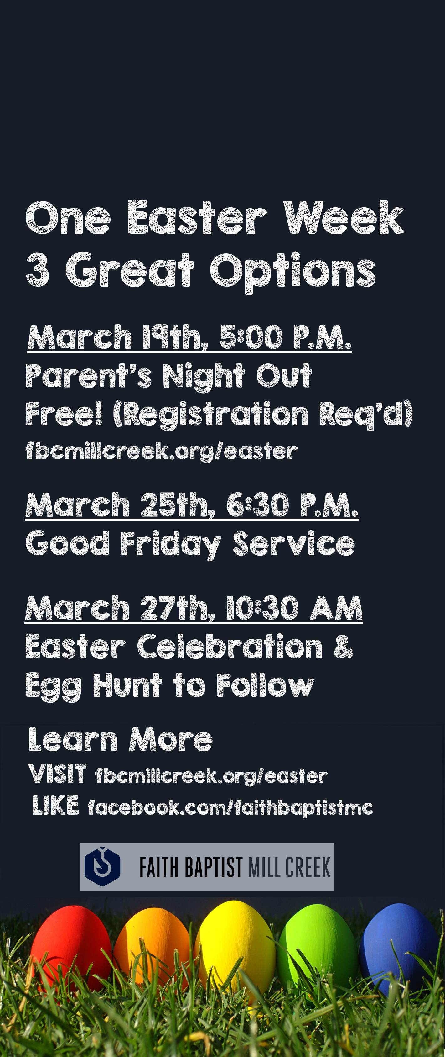 Our Easter celebration continues with our Good Friday service on Friday March 25th at 6:30 P.M. The Good Friday service provides a great opportunity to still your heart before Easter as we remember together the great cost our Savior paid in order to save us.